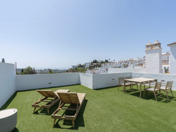 La propriété comprend un salon-salle à manger lumineux avec cheminée et une cuisine ouverte équipée d'appareils électroménagers Siemens haut de gamme. De grandes baies vitrées relient l'intérieur à de spacieuses terrasses, inondant la maison de lumière naturelle. Elle comprend deux chambres et deux salles de bains, dont une attenante, ainsi qu'un vaste solarium privé offrant une vue panoramique.