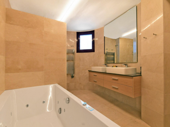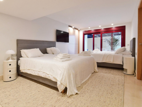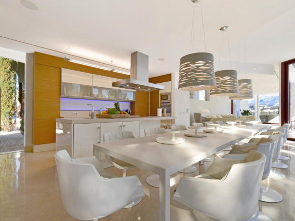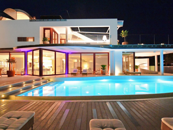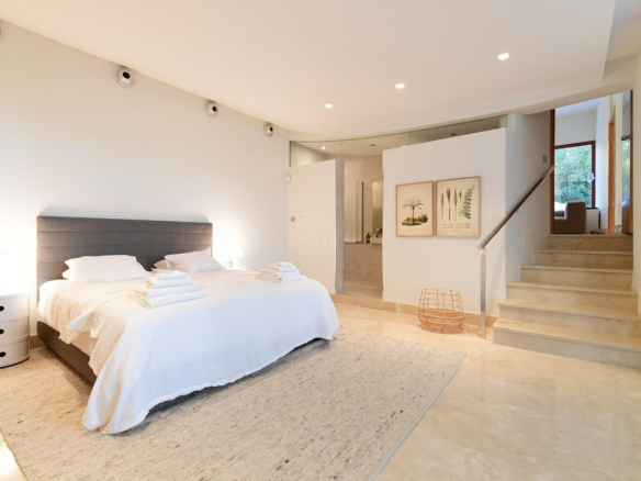 Répartie sur trois niveaux, la villa dispose d’un espace de vie ouvert, spacieux et lumineux, avec un accès direct à la piscine chauffée à débordement et aux terrasses. La cuisine entièrement équipée comprend des appareils haut de gamme, une salle à manger pour 16 personnes, une seconde cuisine et une buanderie.