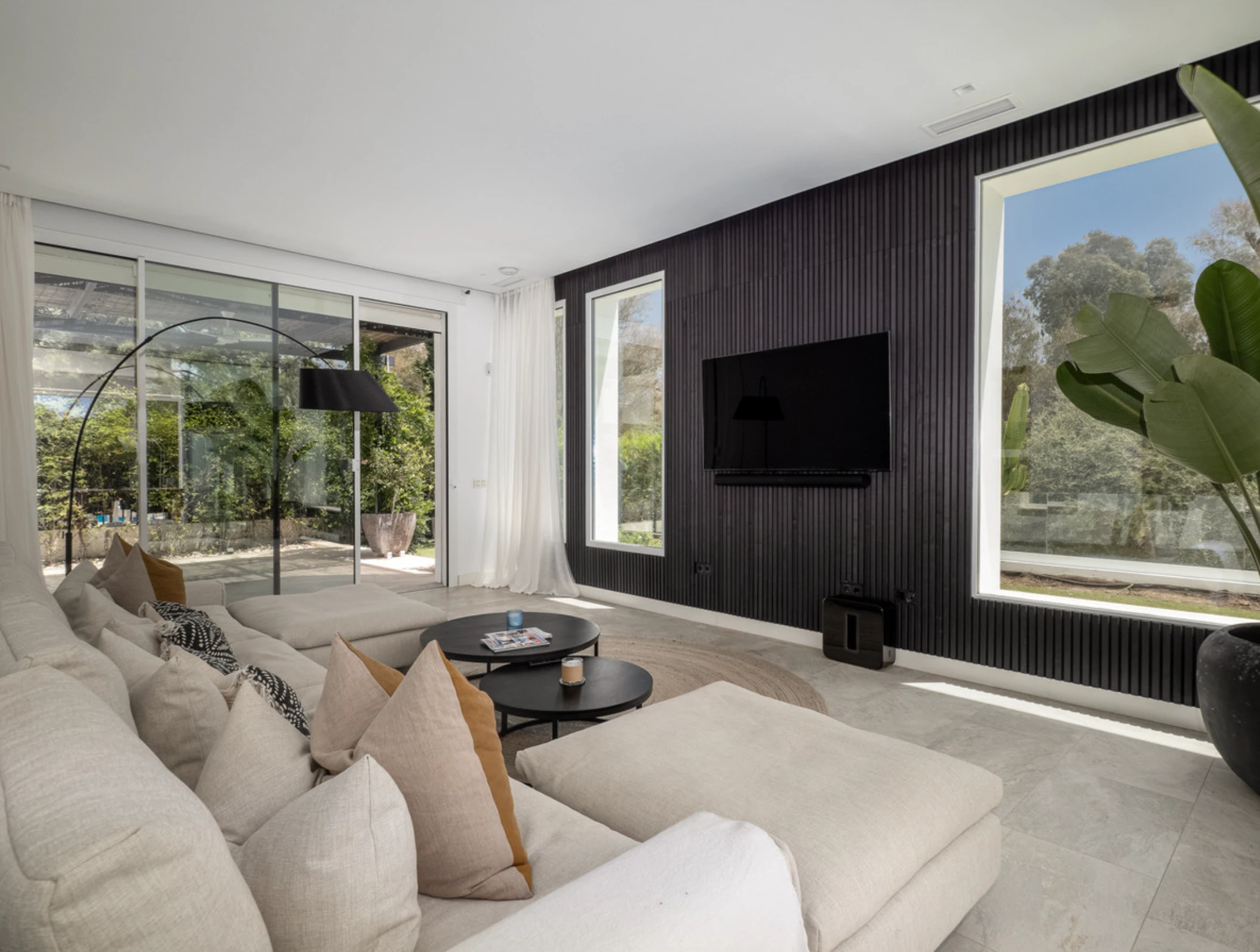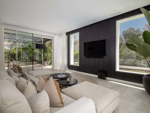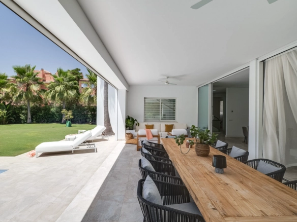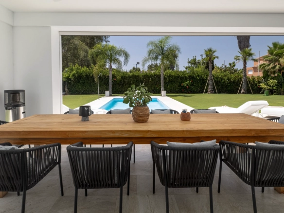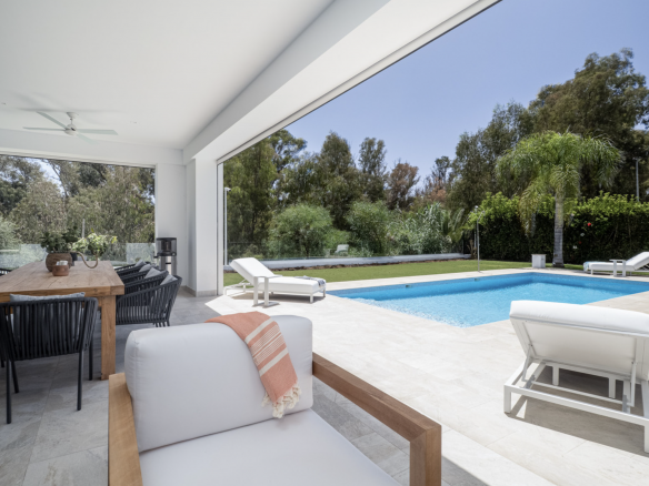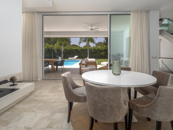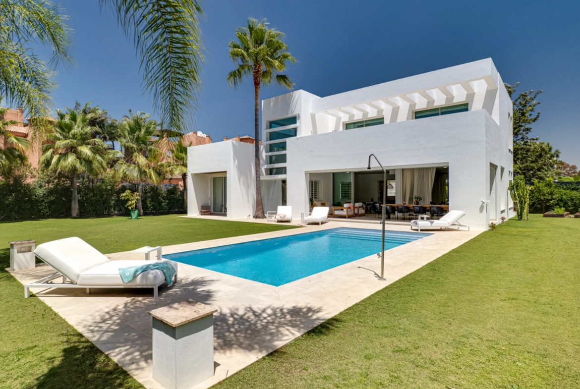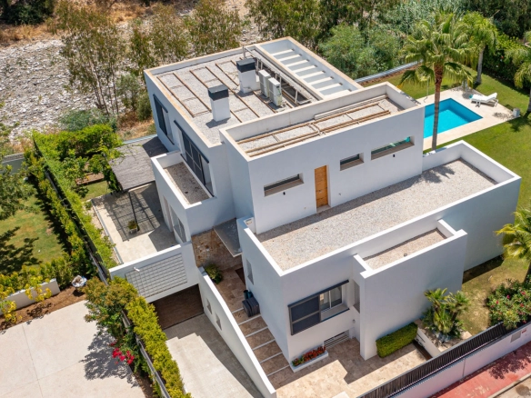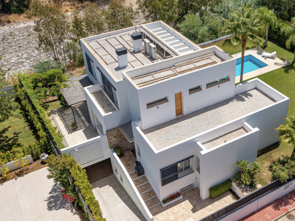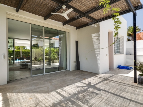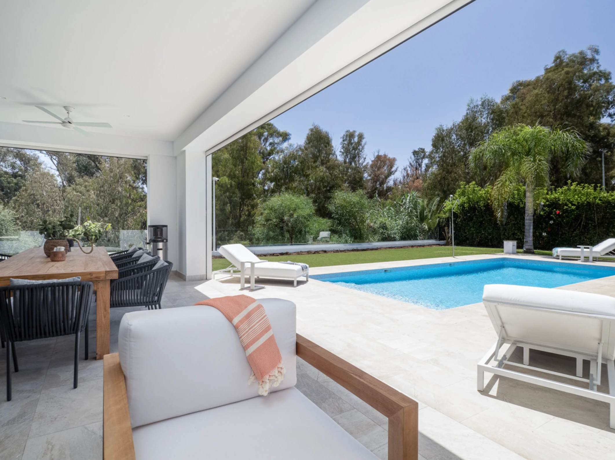 Charming detached villa on a flat plot, just steps from the sea, in the exclusive Casasola area near Guadalmina Baja. Bright and functional Ibiza style, with open-plan living, floor-to-ceiling windows, and seamless access to a covered terrace and pool — all on one level.