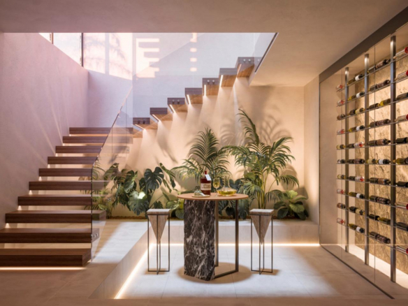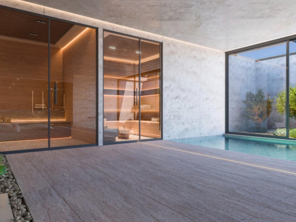 The open-plan living area with an integrated kitchen flows onto the outdoor space, while en-suite bedrooms, an office, and a rooftop solarium with a jacuzzi and outdoor kitchen provide ultimate comfort. The 500 m² basement includes a spa, indoor pool, and a secure garage for three cars.