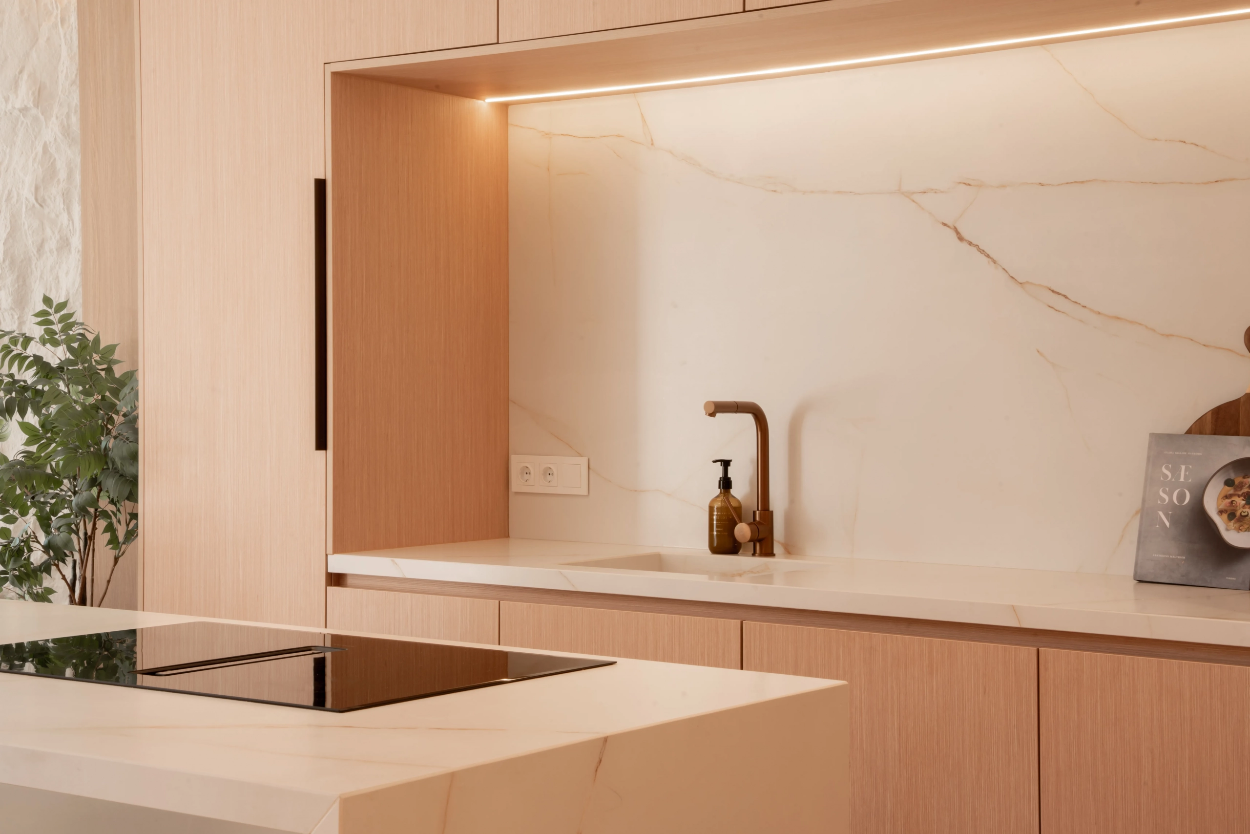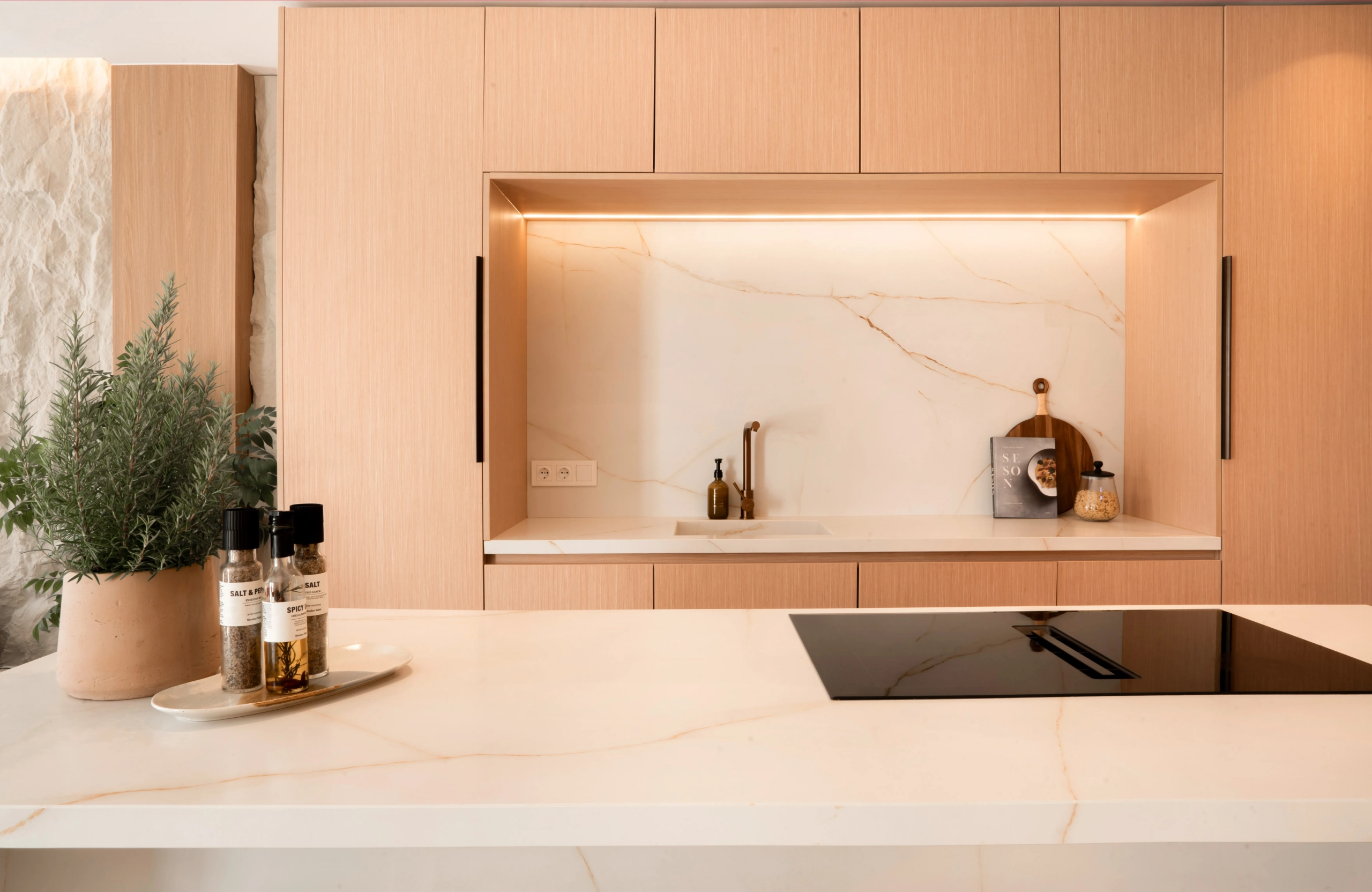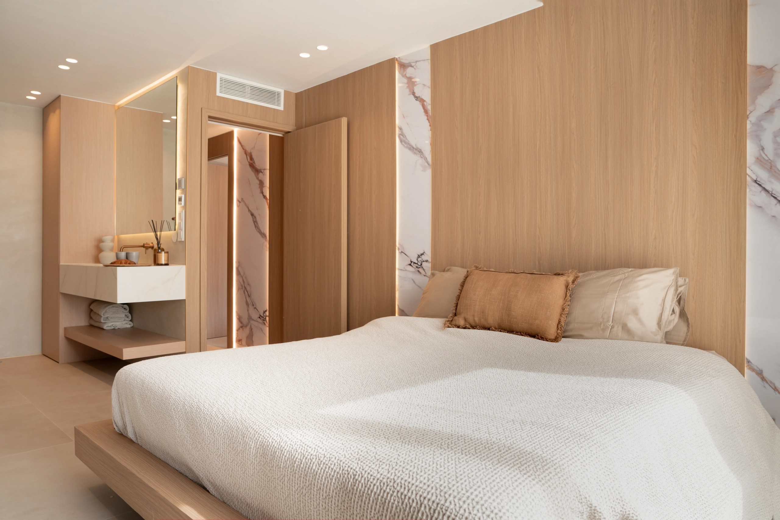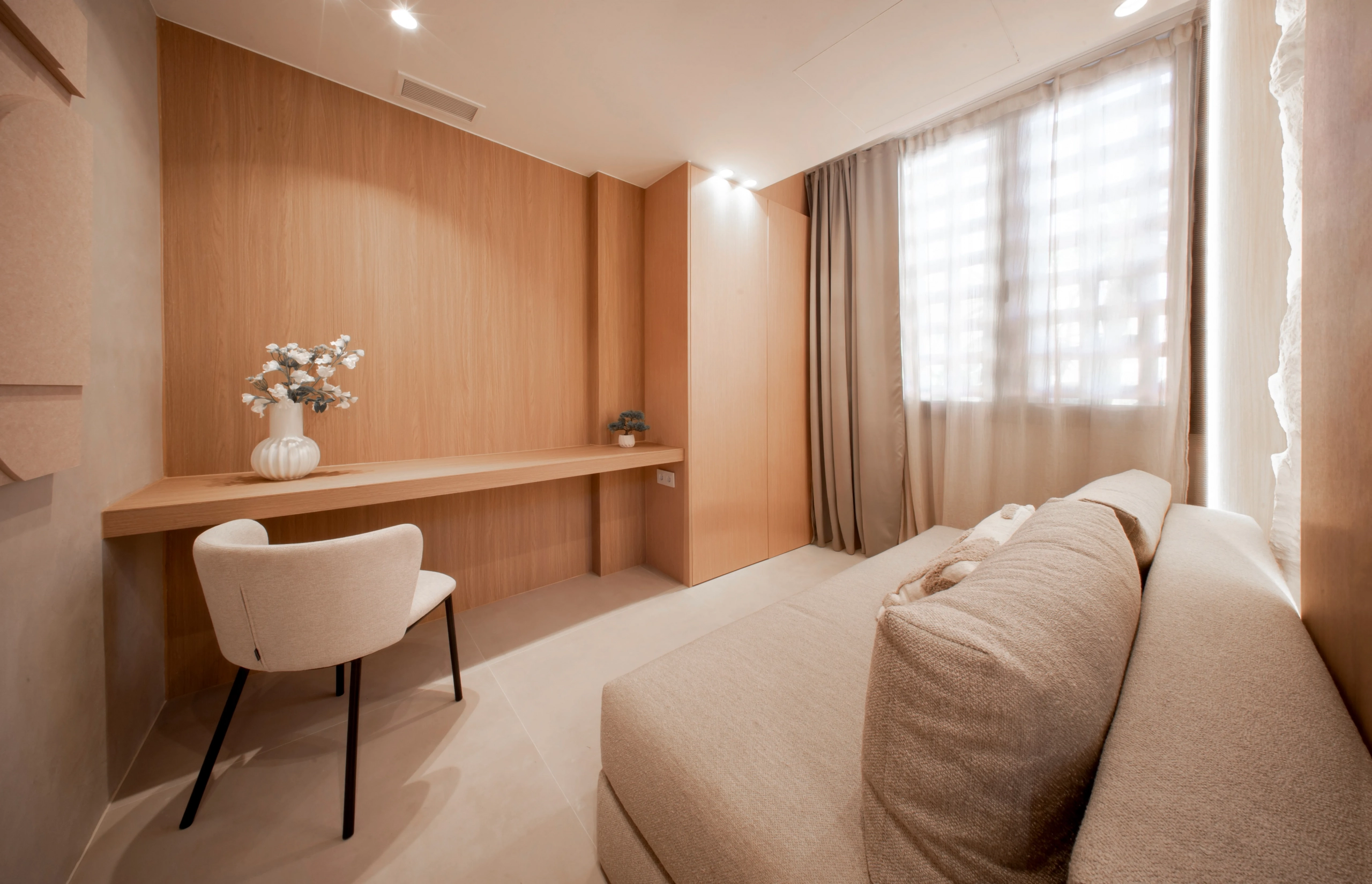 The property offers four bedrooms, one of them en-suite, a second full bathroom and a guest toilet. Recently refurbished with high-quality finishes, it features an open-plan kitchen, bright living areas, micro-cement details, bespoke carpentry, stone floors, and central air conditioning with Airzone. The bathrooms benefit from underfloor heating.
