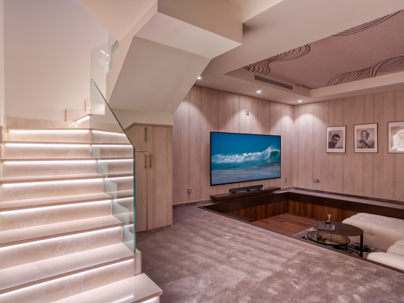 The main floor includes an open-plan living and dining area, fully equipped kitchen, master suite with access to the terrace, two guest suites, and a guest toilet. The lower level features an additional bedroom, bathroom, laundry area, and a cozy cinema room with a bar.