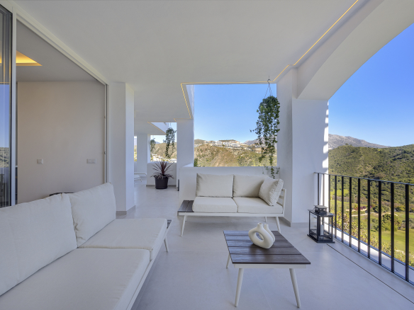 Set in the peaceful hills of Benahavís, this three-bedroom apartment is located in the gated community of Altos de La Quinta. The property enjoys open views of the Mediterranean Sea, the golf course and the surrounding mountains, just a short drive from Marbella and Puerto Banús.