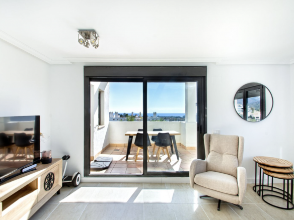 The property has 2 large bedrooms, 2 bathrooms (one en suite), a bright living room with sea and mountain views, and a spacious private terrace – perfect to enjoy the sun and relax. The kitchen is fully equipped, and a private parking space and storage room are included.